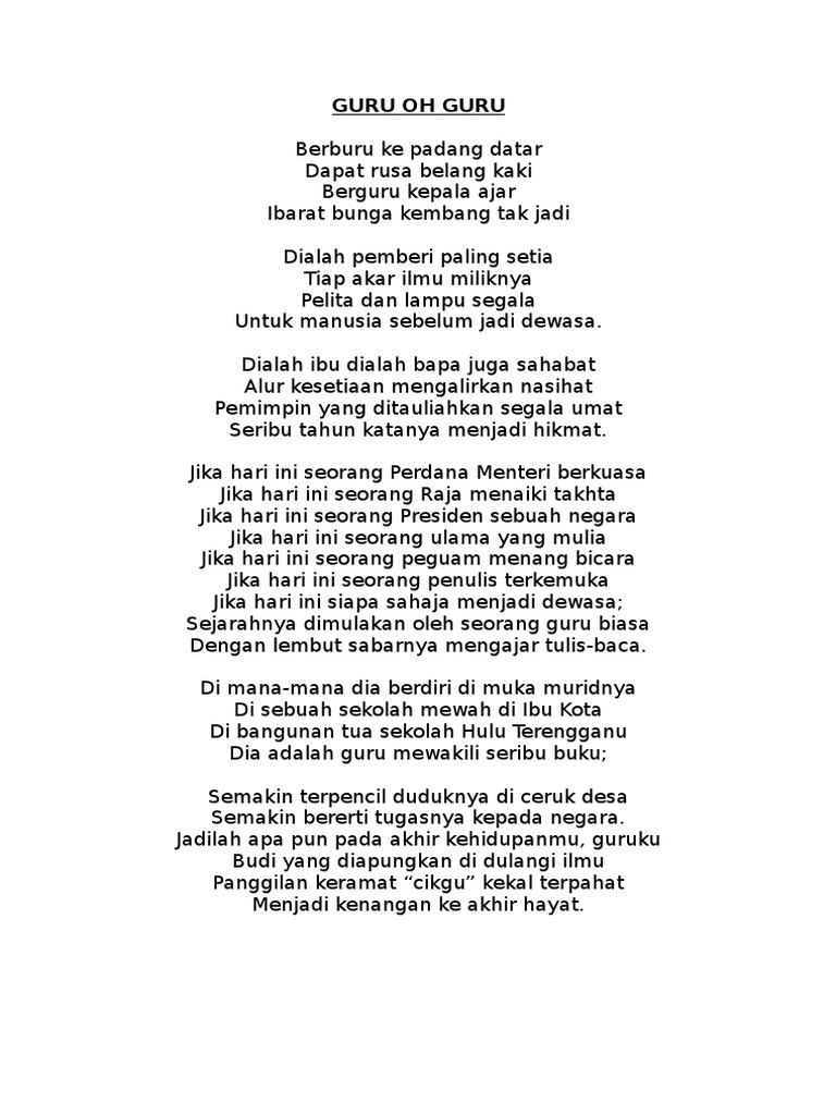 Berburu ke padang datar. Lagu Guru Oh Guru Koir MD Video ini dibuat sempena Hari Guru 2019 yang disambut pada setiap 23 September 2019Kerjasama guru dan murid-murid sekolah Rendah. Pagiku Cerah Matahari Bersinar Lirik Lagu Guruku Tersayang yang Pasti Sering Baaanget Kamu Dengar.